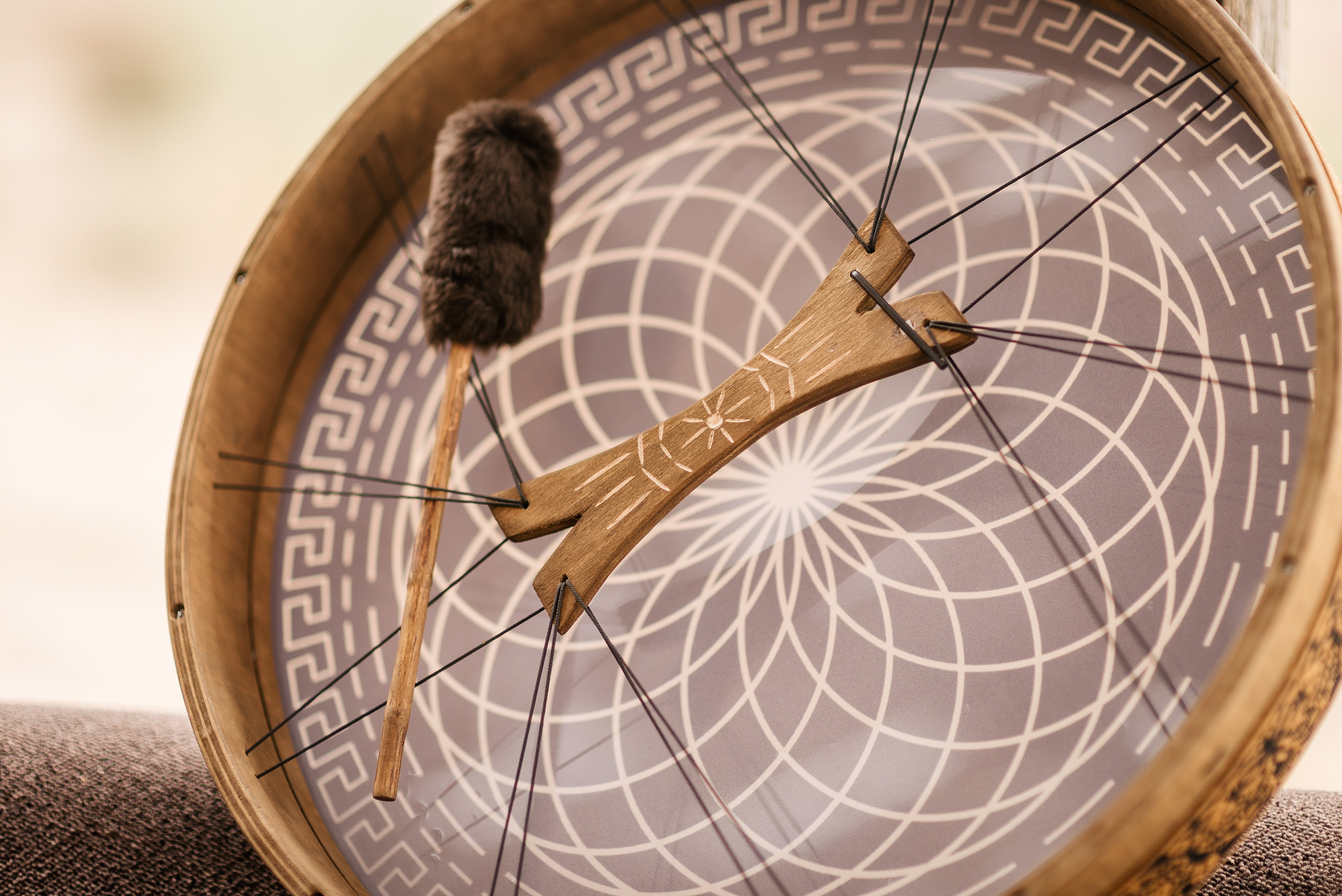 ** a stick for playing (shaman beater) is included in the set, made from acacia or linden wood. For the soft material, we use faux fur (synthetic wool), and so that it is also vegan.